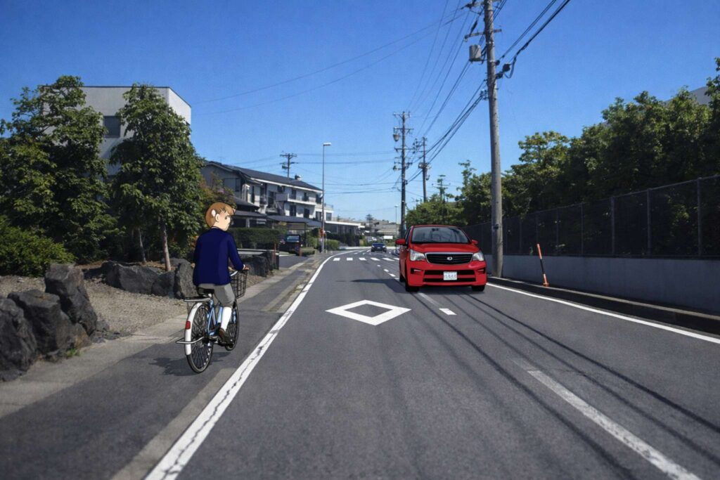 さらに今回特に注意すべきは『ガードレールのない道路』という点です。物理的な壁がない場所では、自転車はいつでも、どこからでも横断を始めてしまいます。