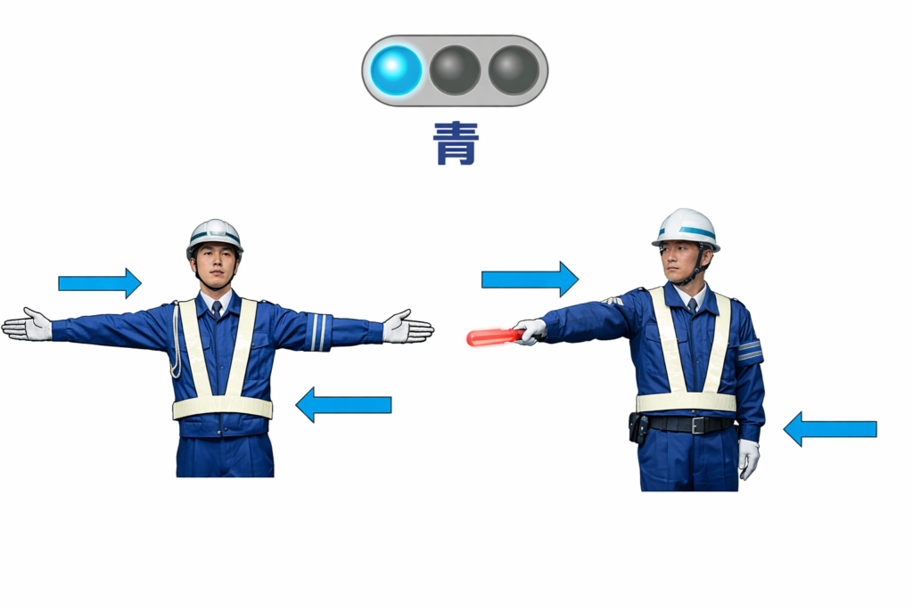 ・警察官の「横顔(肩)」が見えている方向=青信号(進むことができる)
