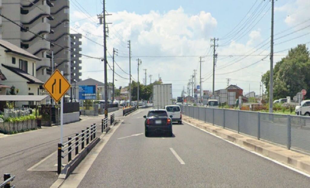 例えば、**稲沢市にある「県道161号(ケヤキ通り)」**では、それまでの二車線道路から、左車線が減少して一車線になります。