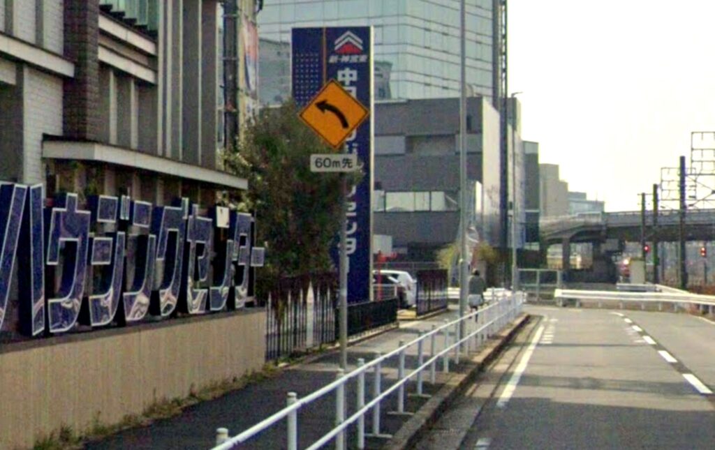 それまで片側一車線の走りやすい道路だったのに、**昭和区の「鶴舞(つるま)小学校東」**近くにある幅員減少の標識を通過すると、状況が一変します。