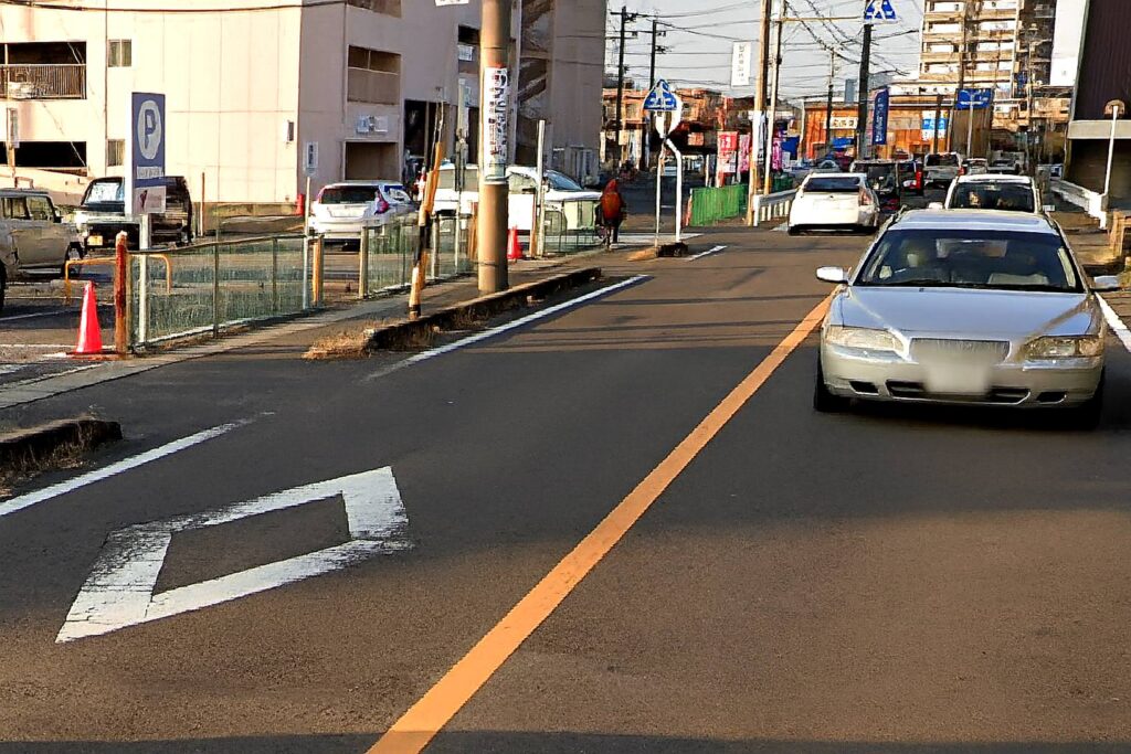 遠くの看板(標識)だけでなく、足元のペイント(標示)もセットで確認することで、