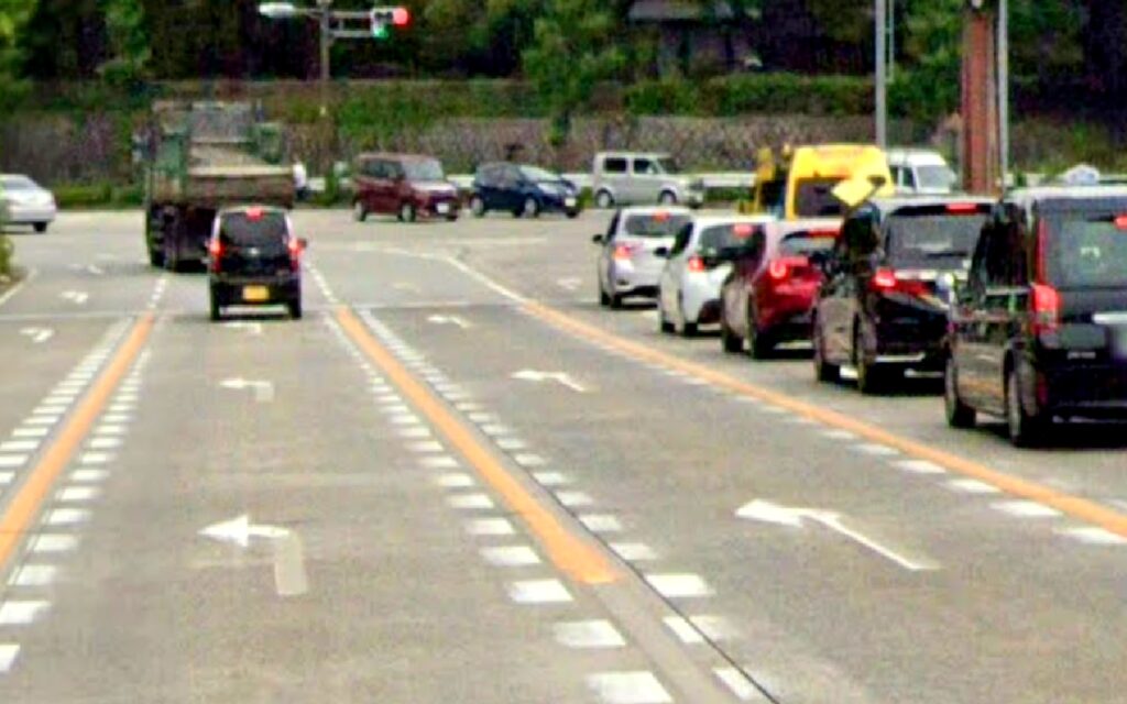 ここで「あ、こっちじゃなかった!」と右側のレーンに移動したくても、**進路変更が禁止された黄色の線(車両通行帯)**では、移動ができなくなってしまいます。