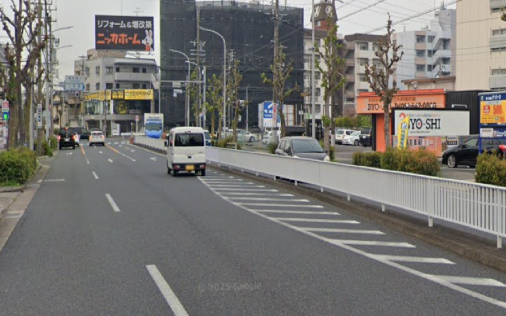 ・解説: 車の流れをスムーズにするための「誘導」ですが、あえてここを走行して右折レーンに入る車(名古屋走り?)も多いです。トラブルを避けるなら踏まないのが無難ですが、法的には走行可能です。