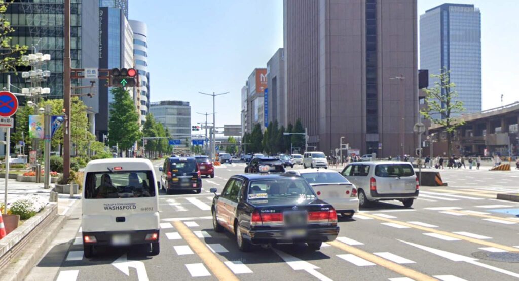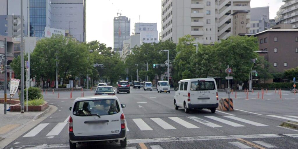 特に、写真の中区新栄「広小路葵(ひろこうじあおい)」交差点のように、交差点内にポールなどが設置されている場所では注意が必要です。