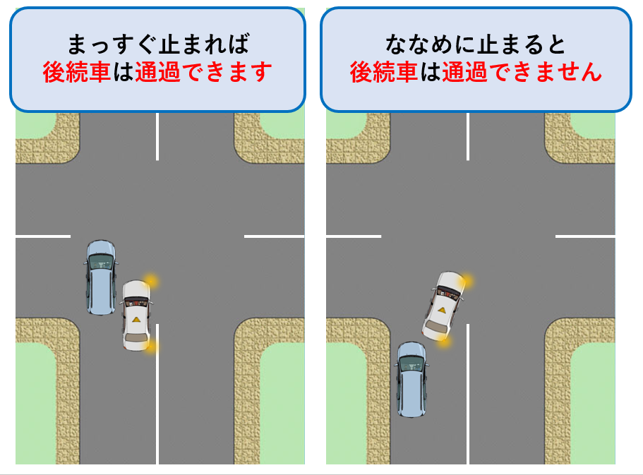 また、ハンドルを切って斜めに待つのではなく、**「まっすぐ止まる」**と、万が一後ろから追突された時に対向車線に飛び出さずに済みます。
