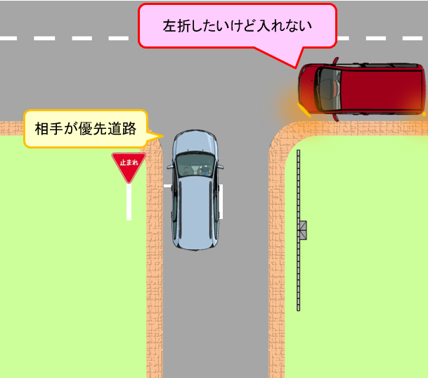 交差点だけでなく、コンビニや駐車場に入るときも「優先関係」があります。