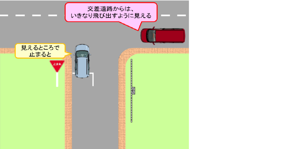 「止まれの線に合わせて止まっても、安全確認ができない(交差道路の状況が見えない)。だから、止まるなら見える位置に止まらないと意味がないんだ」