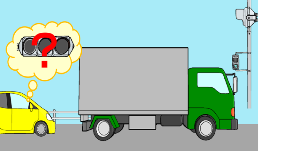 特に、大型のバスやトラックのすぐ後ろを走行すると、信号が見えず**「赤信号に気が付かない」**ということが起こります。