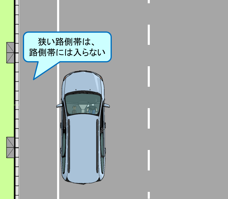 もし路側帯が狭くて0.75m空けられない場合は、路側帯に入らず、白線の右側(車道)に沿って停めます。