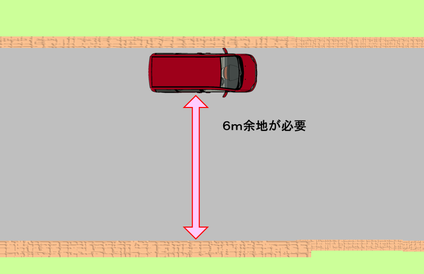 特にここでご注意いただきたいのが、もともとの道幅が3.5mや6m必要という意味ではなく、車を止めた後の残り幅がそれだけ必要ですという意味になりますので、お間違いのないようにお願いいたします。
