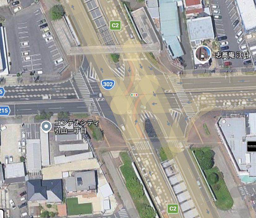 そのため、交差点の手前や通過直後に、「バスレーンに入らないよう左へ逃げる車」と、「302号線へ曲がるために進路変更する車」が激しく錯綜し、接触事故のリスクが一気に跳ね上がります。