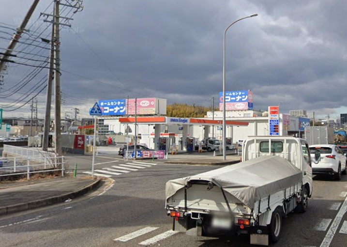 国道153号は、名古屋方面からも豊田方面からも、**交差点に向かって「下り坂」**になっています。車の速度が自然に上がってしまう下り坂の途中に、ホームセンターやガソリンスタンドなどの「店舗出入口」が密集しているのです。