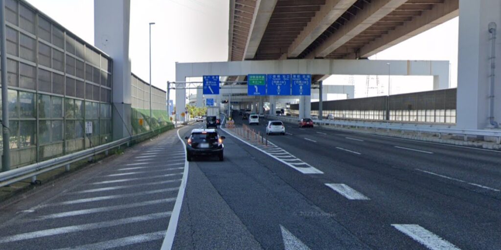 物流の大動脈であるため大型トラックが非常に多いうえに、頭上には巨大な高架の橋脚が林立しています。