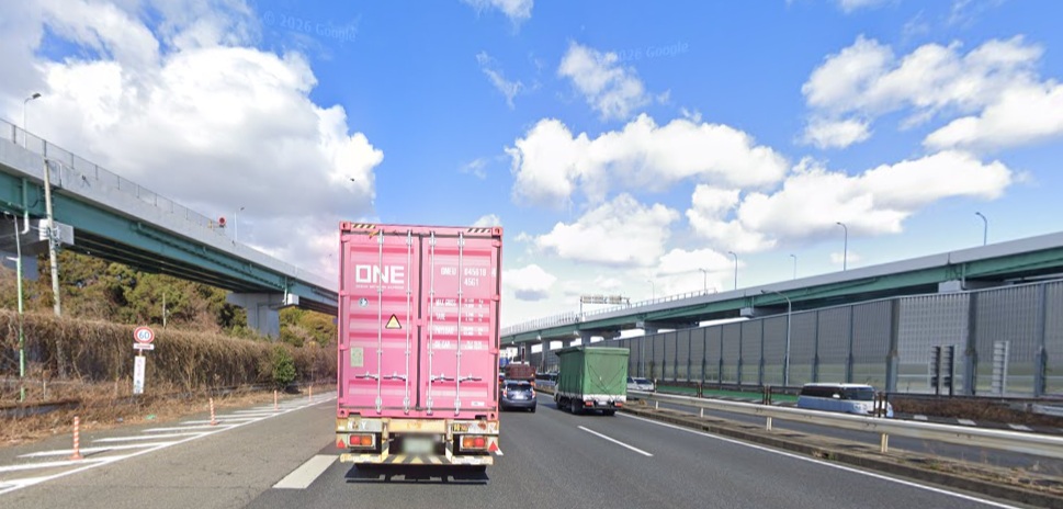 この区間は物流の大動脈であるため、大型トラックが非常に多く走っています。トラックの後ろを走っていると前方の渋滞や信号が全く見えなくなり、状況が読みづらくなります。
